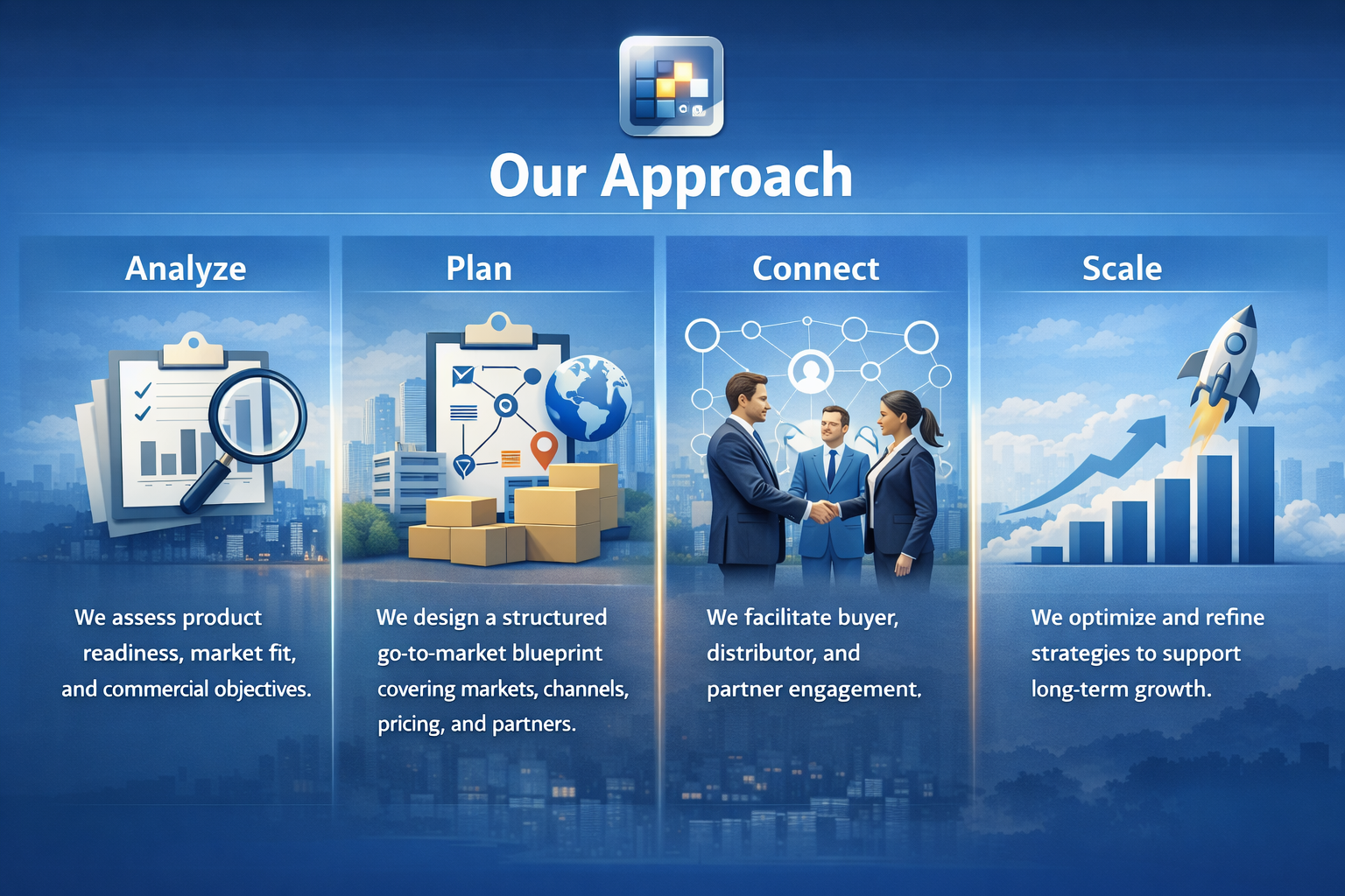 We design a structured go-to-market blueprint covering markets, channels, pricing, and partners.